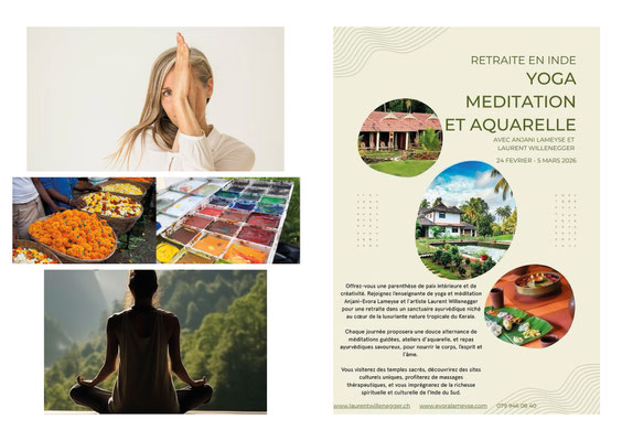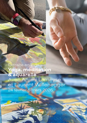 En mars 2026, vivez un séjour original et unique en INDE organisé entre cours de yoga et de peinture à l'aquarelle. Paix intérieure et créativité au coeur de la luxuriante nature du Kerala (sude de l'Inde) avec Anjani-Evora Lameyse et Laurent Willenegger. Du 24 février au 5 mars 2026, prix CHF 2600.- hors vol, tout compris. Demandez quelques détails au besoin ;)
